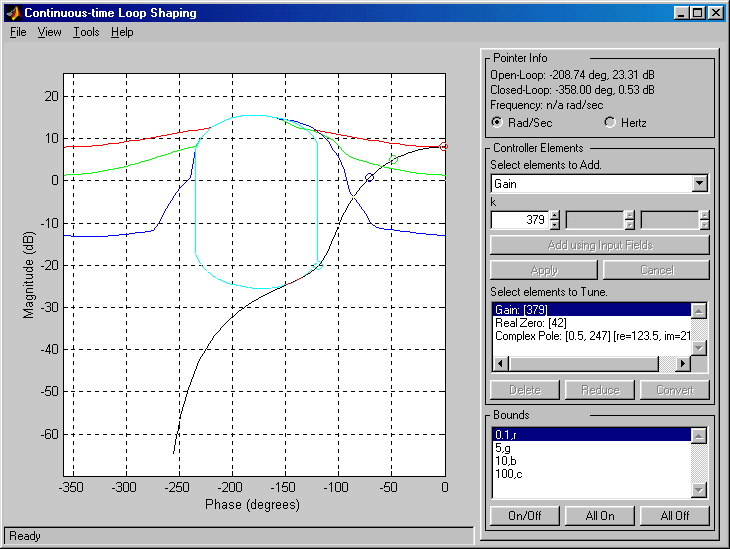 Powerful bound computation routines help in the conversion of input/output closed-loop performance specification into constraints (bounds) on the open-loop function. These bounds are then used in the IDE. Click image to enlarge.